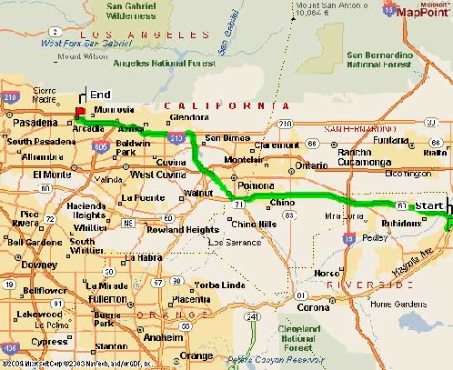 Start: Depart Riverside, California, United States on University Ave (West) 0.1 miles 1: Turn RIGHT (North) onto Market St 1.5 miles 2: Take Ramp (LEFT) onto SR-60 [Pomona Fwy] towards CA-60 / Los Angeles 21.3 miles 3: Turn RIGHT onto Ramp towards CA-71 / Corona / Pomona 0.3 miles 4: Keep RIGHT to stay on Ramp towards CA-71 / Pomona 0.6 miles 5: Take Ramp (LEFT) onto SR-71 [Chino Valley Fwy] 4.3 miles 6: Take Ramp onto SR-57 [Orange Fwy] 3.7 miles 7: Take Ramp (LEFT) onto I-210 [Foothill Fwy] towards I-210 / Pasadena 11.7 miles 8: Turn RIGHT onto Ramp towards Huntington Dr / Arcadia 0.3 9: Turn RIGHT (West) onto (W) Huntington Dr [US Historic Route 66] 0.5 10: Turn RIGHT (North) onto N 2nd Ave 0.2 11: Turn LEFT (West) onto E St Joseph St 0.1 End: Arrive 141 E St Joseph St, Arcadia, CA 91006 |