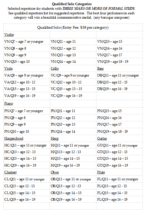 Selected repertoire for students with THREE YEARS OR MORE OF FORMAL STUDY. See qualified repertoire list for suggested repertoire.  The best four performers in each category will win a beautiful commemorative medal.  (any baroque and early classical period composers)   For Clarinet any transcript music can be used. Please arrive 15 minutes prior to your scheduled performance. Make sure to register at the front desk and fill out the comment sheets with your contest info and repertoire for judges to use. You may sign up other two Qualified categories. Contestant who sign up these categories may not sign up with any of the Prodigy and Open categories. .